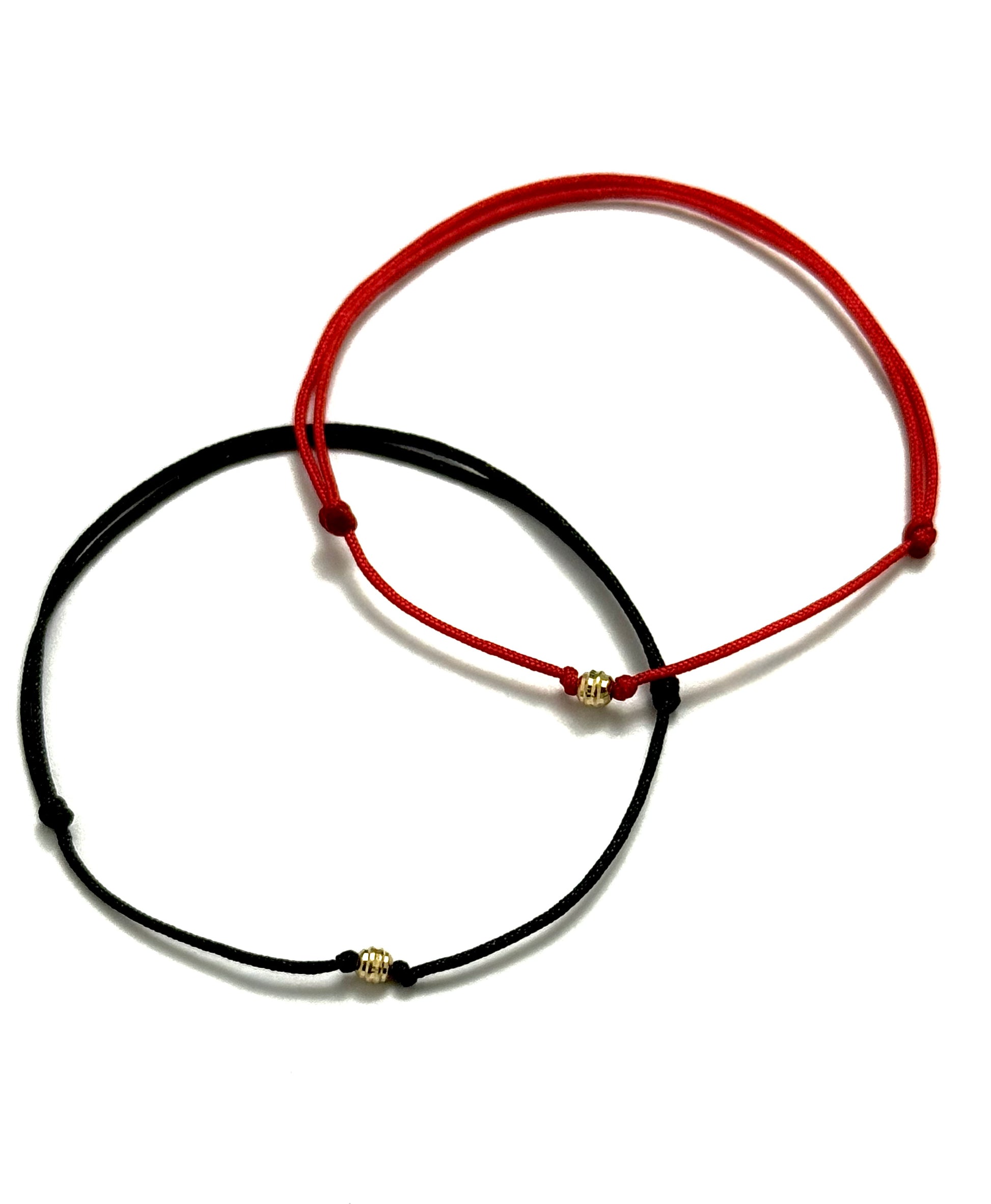 Комплект гривни с червен/черен конец и златно топче – стилен и семпъл аксесоар, символ на късмет, защита и положителна енергия. Изработена от здрав червен/черен конец и елегантно златно топче, подходяща за всеки ден и лесна за комбиниране с други бижута.