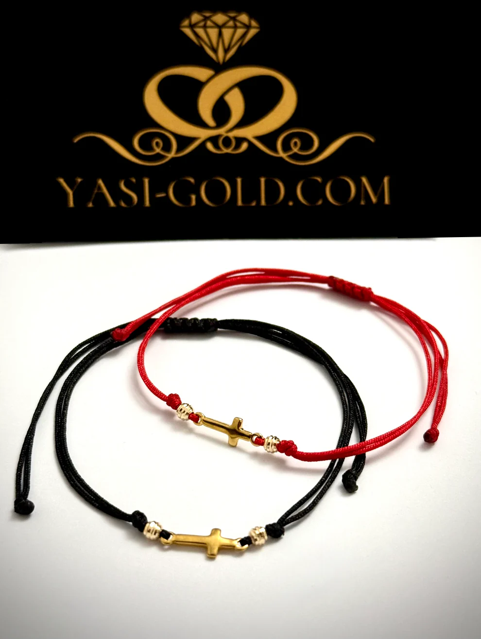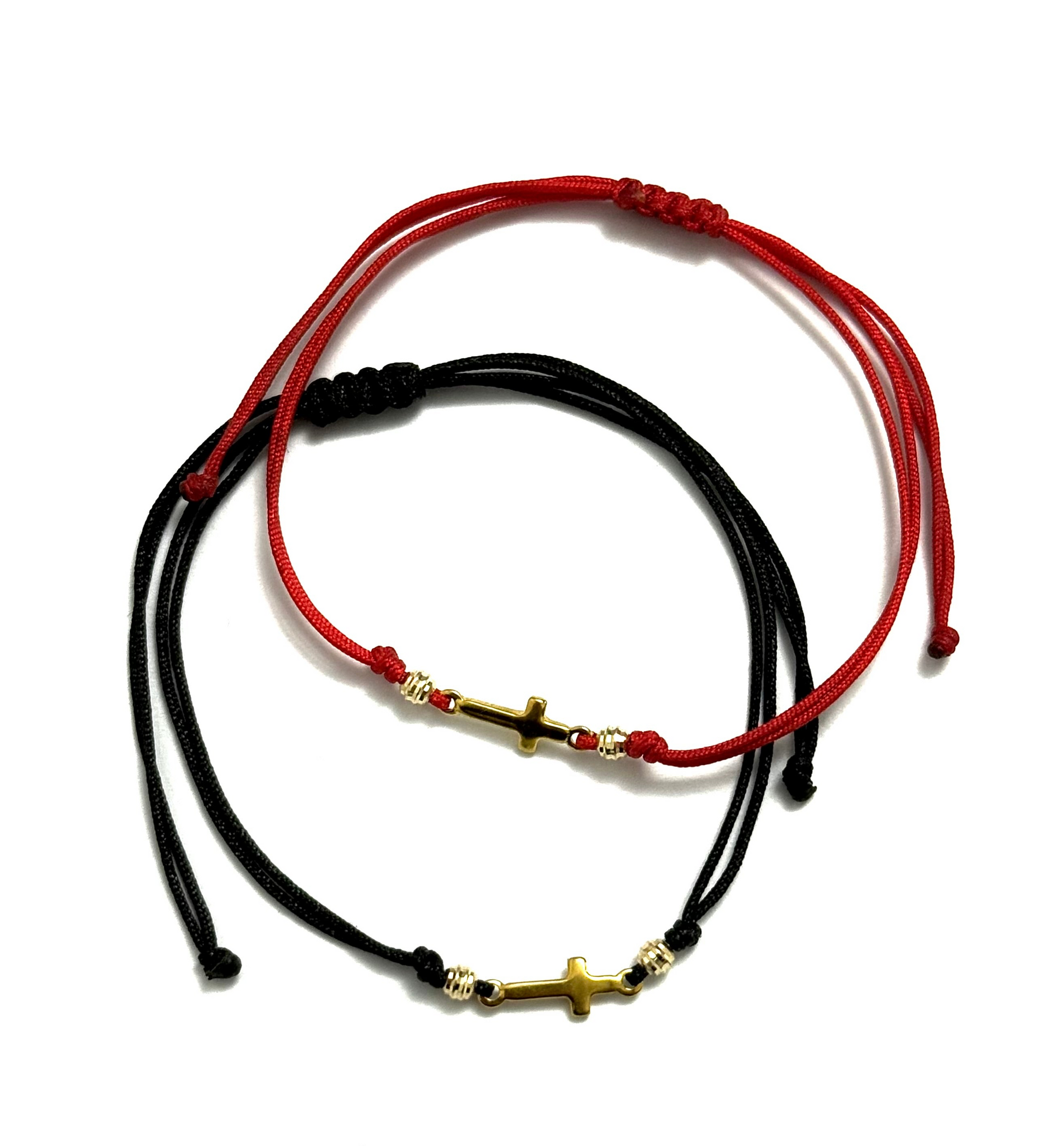 Тези гривни са стилен и символичен аксесоар, изработен от черна и червена, устойчива връв с регулируема дължина. В центъра ѝ е разположен малък кръст, който придава изискан и минималистичен вид, а също така носи духовно и защитно значение. Две малки златни топчета от двете страни на кръста добавят финален акцент, придавайки на гривните балансирана и модерна визия.